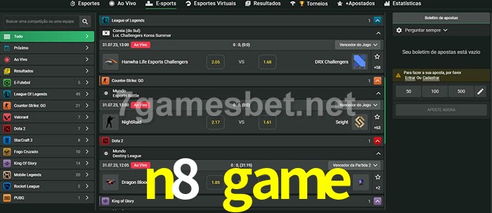 O n8 game oferece uma grande seleção de opções de apostas em e-sports com probabilidades competitivas